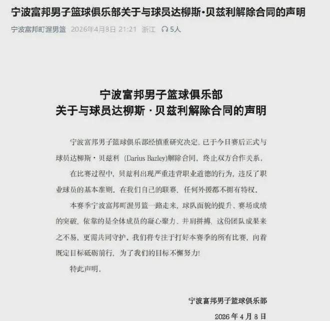 宁波队丝毫不惯着,以贝兹利出现严重违背职业道德行为为由,直接让他卷铺盖走人。