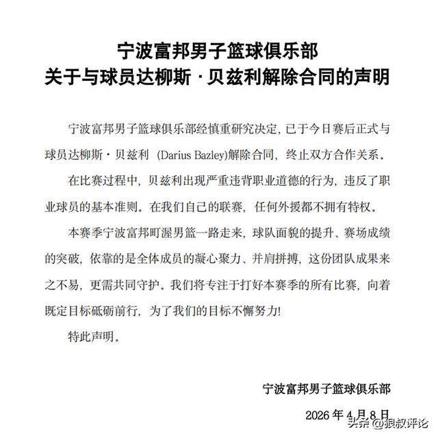 宁波男篮官方表示:贝兹利出现了严重违背职业道德的行为,违反了职业球员的基本准则,在我们的联赛,任何外援都不拥有特权。